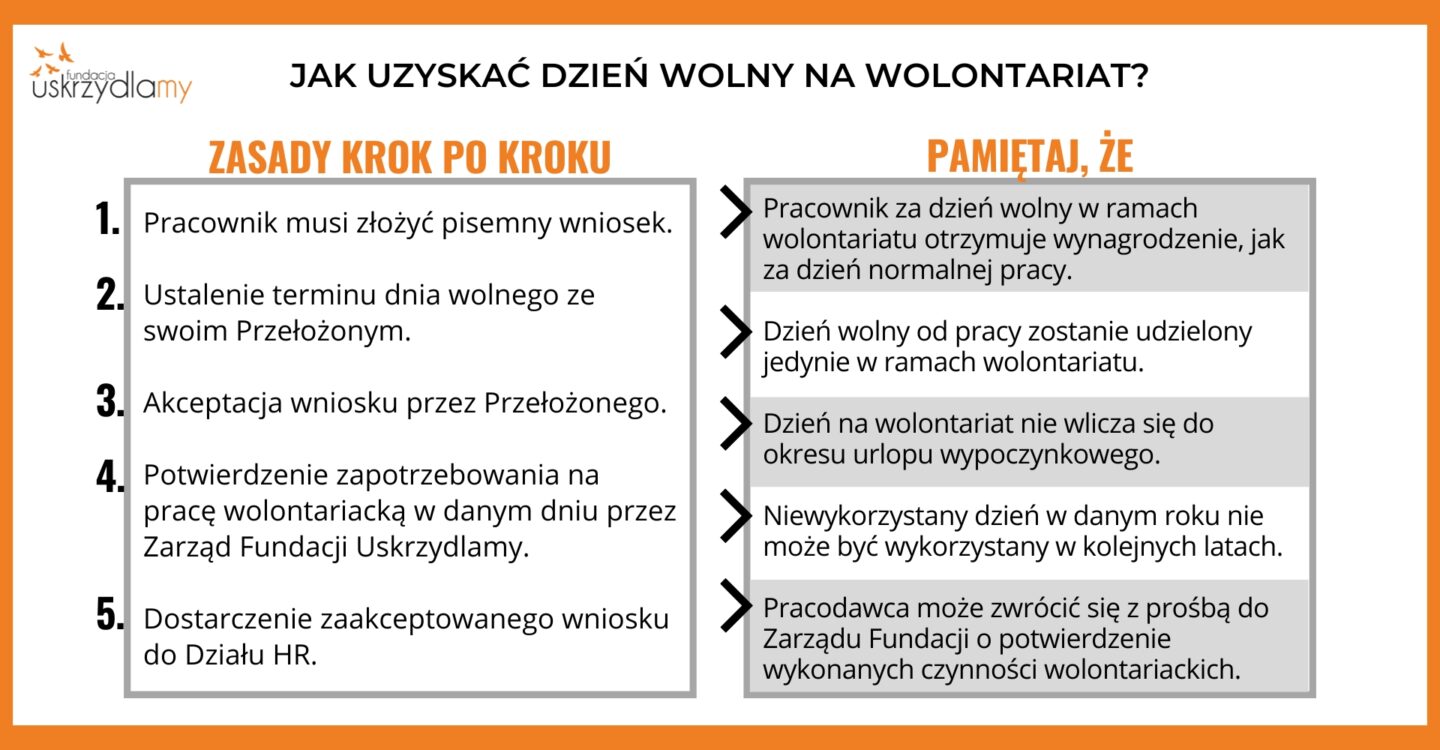 Pracownicy ze spółek SuperDrob S.A. oraz CPF Poland mogą skorzystać z dodatkowego dnia wolnego na wolontariat pracowniczy na rzecz Fundacji Uskrzydlamy. Pamiętajmy, że przysługuje tylko jeden dzień w ciągu roku. Zapoznajcie się z poniższymi wytycznymi: