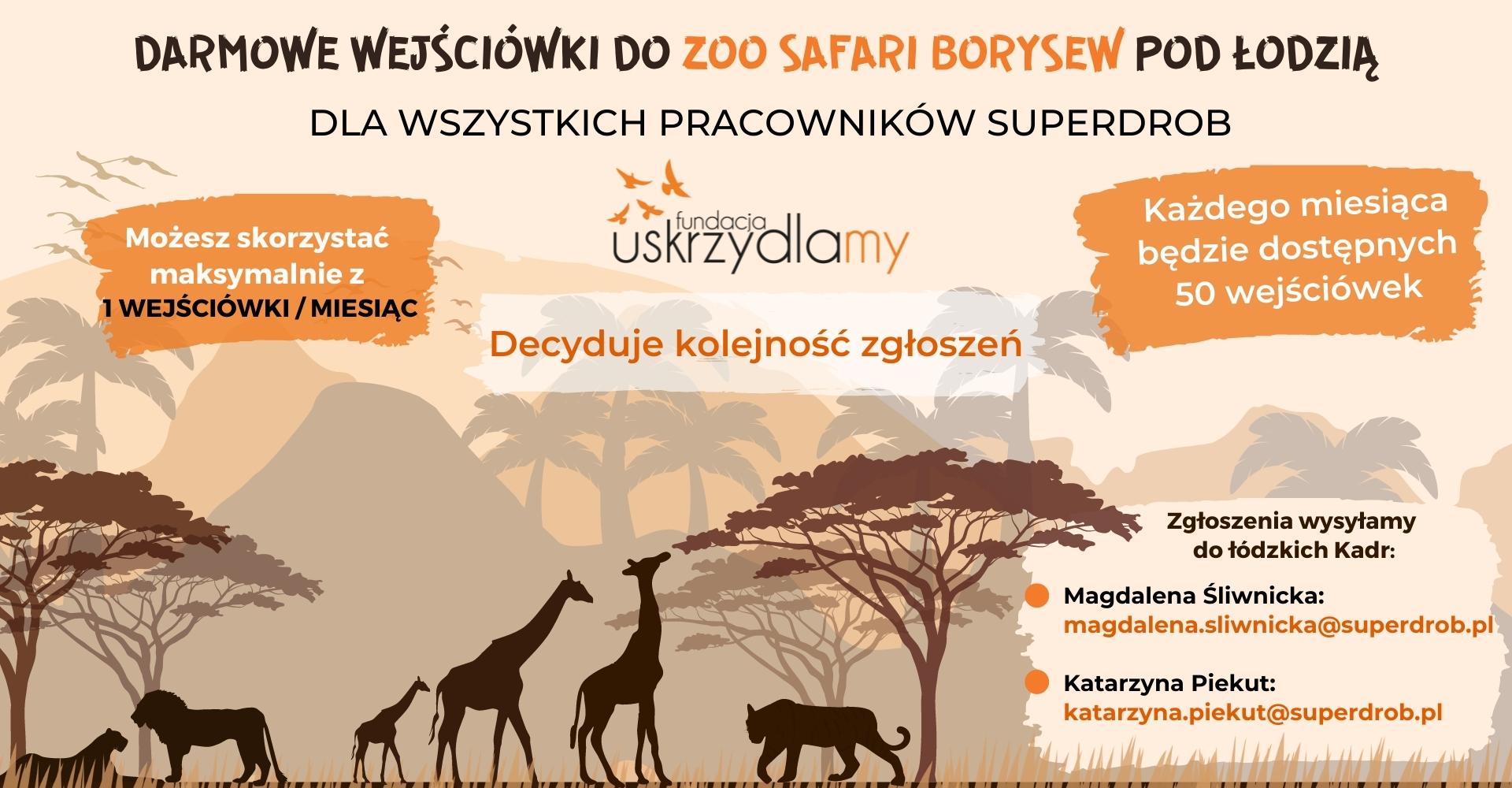 Dzięki współpracy Fundacji „Uskrzydlamy” z ZOO w Borysewie (zlokalizowanym w województwie łódzkim) mamy możliwość korzystania z bezpłatnych wejść. Ilość wejściówek do ZOO jest ograniczona – każdego miesiąca dostępnych jest łącznie 50 sztuk, dlatego decyduje kolejność nadesłanych zgłoszeń. Akcja dedykowana jest wszystkim pracownikom SuperDrob. Warto pamiętać, że dla pracowników wszystkich spółek do dyspozycji są karty do ZOO w Warszawie.