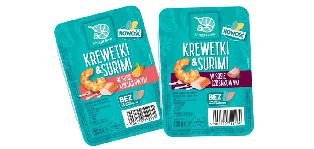 Na półkach sklepów Biedronka mogliśmy znaleźć nasze krewetki i surimi, czyli przekąski na raz w dwóch smakach – w sosie czosnkowym oraz koktajlowym.