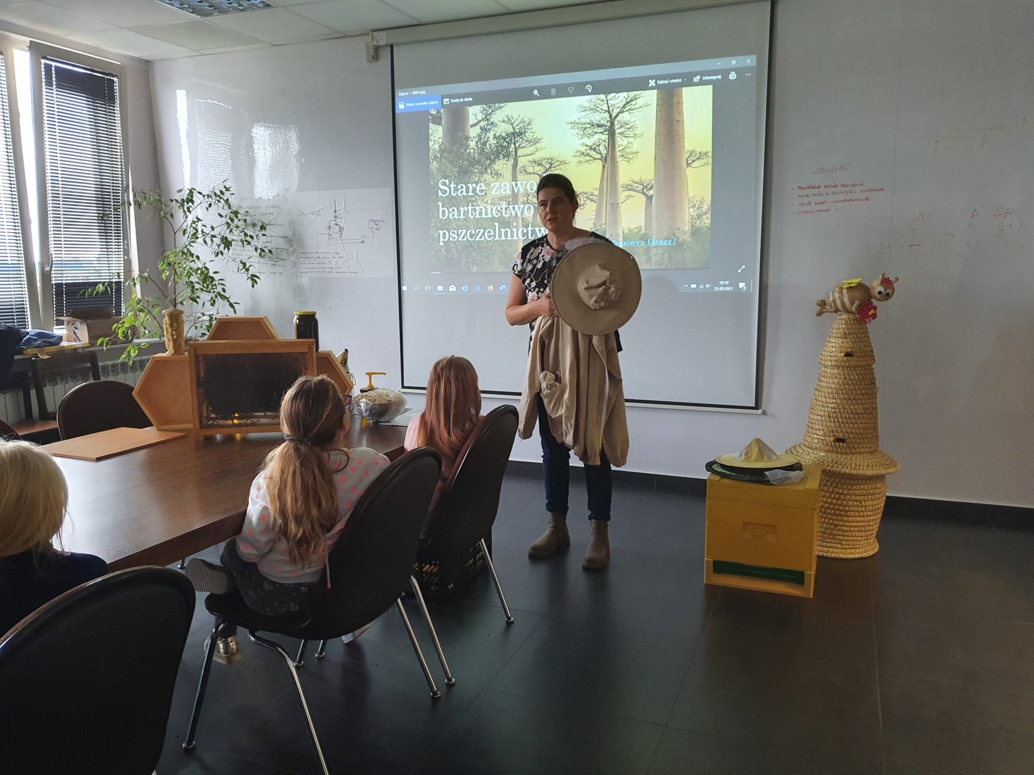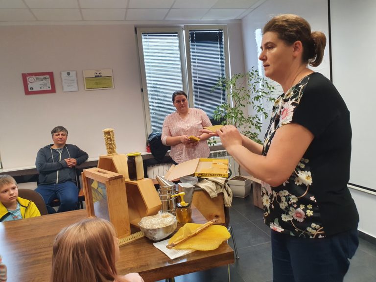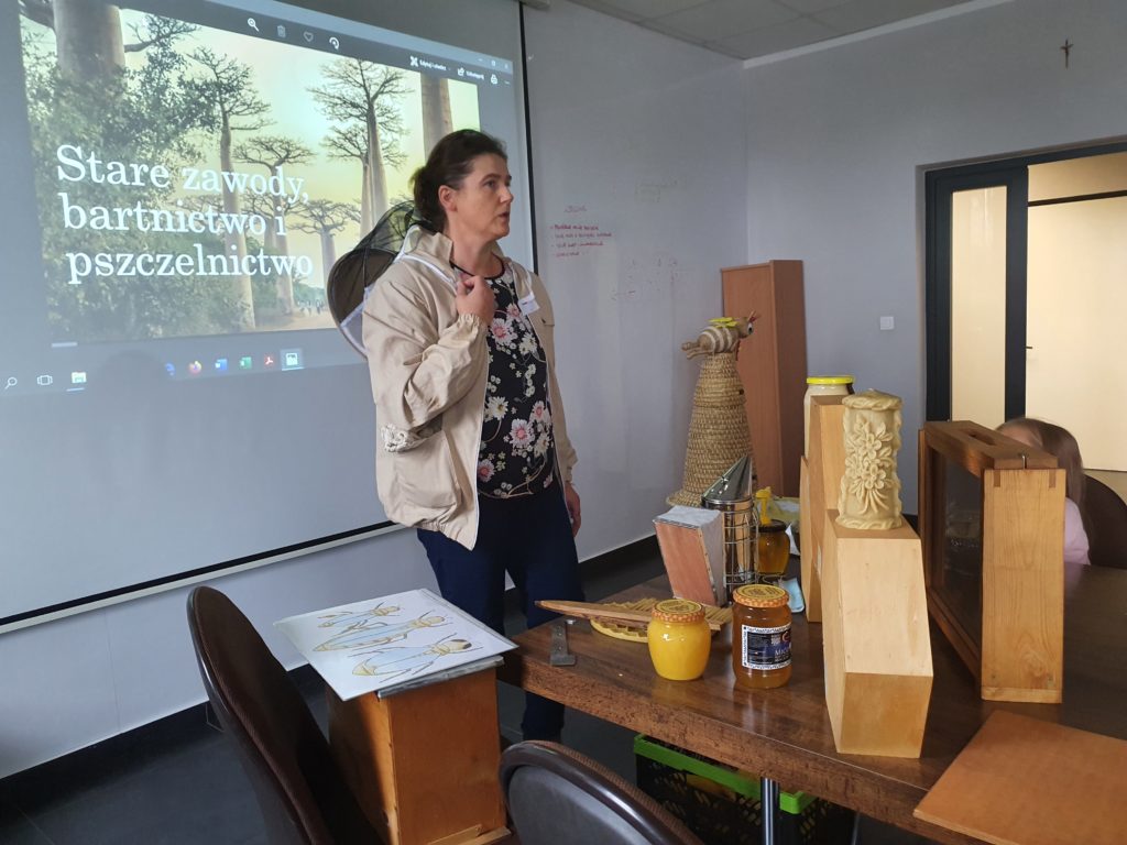 Warsztaty poprowadziła pani Renata Rudolf, właścicielka i pasjonatka pszczelarstwa „Księżycowa Pasieka – Miody z Urzecza”. Gospodarstwo pasieczne pani Renaty jest położone w naszych rejonach Wisły, a dokładnie w malowniczej dolinie Urzecza.
