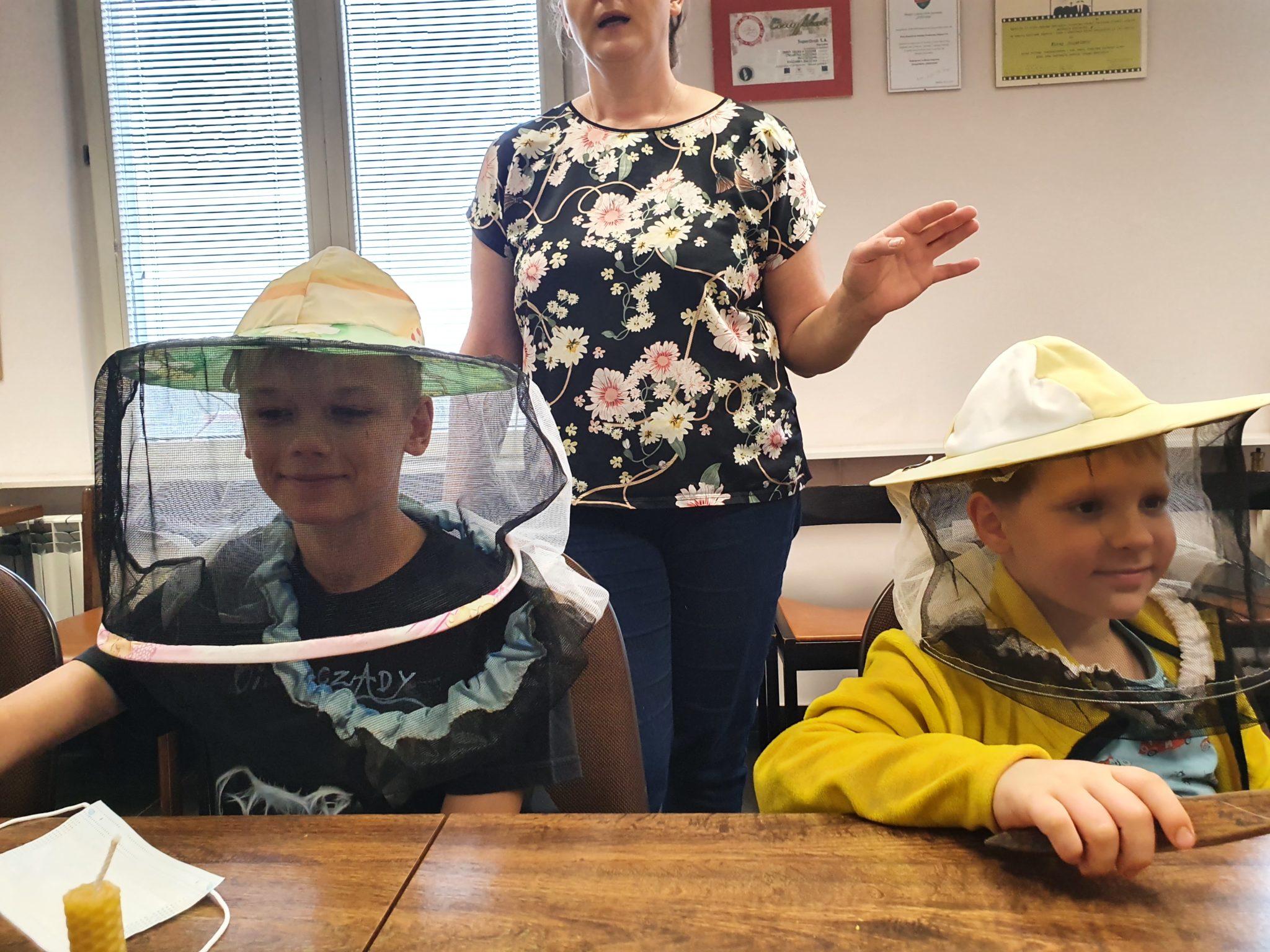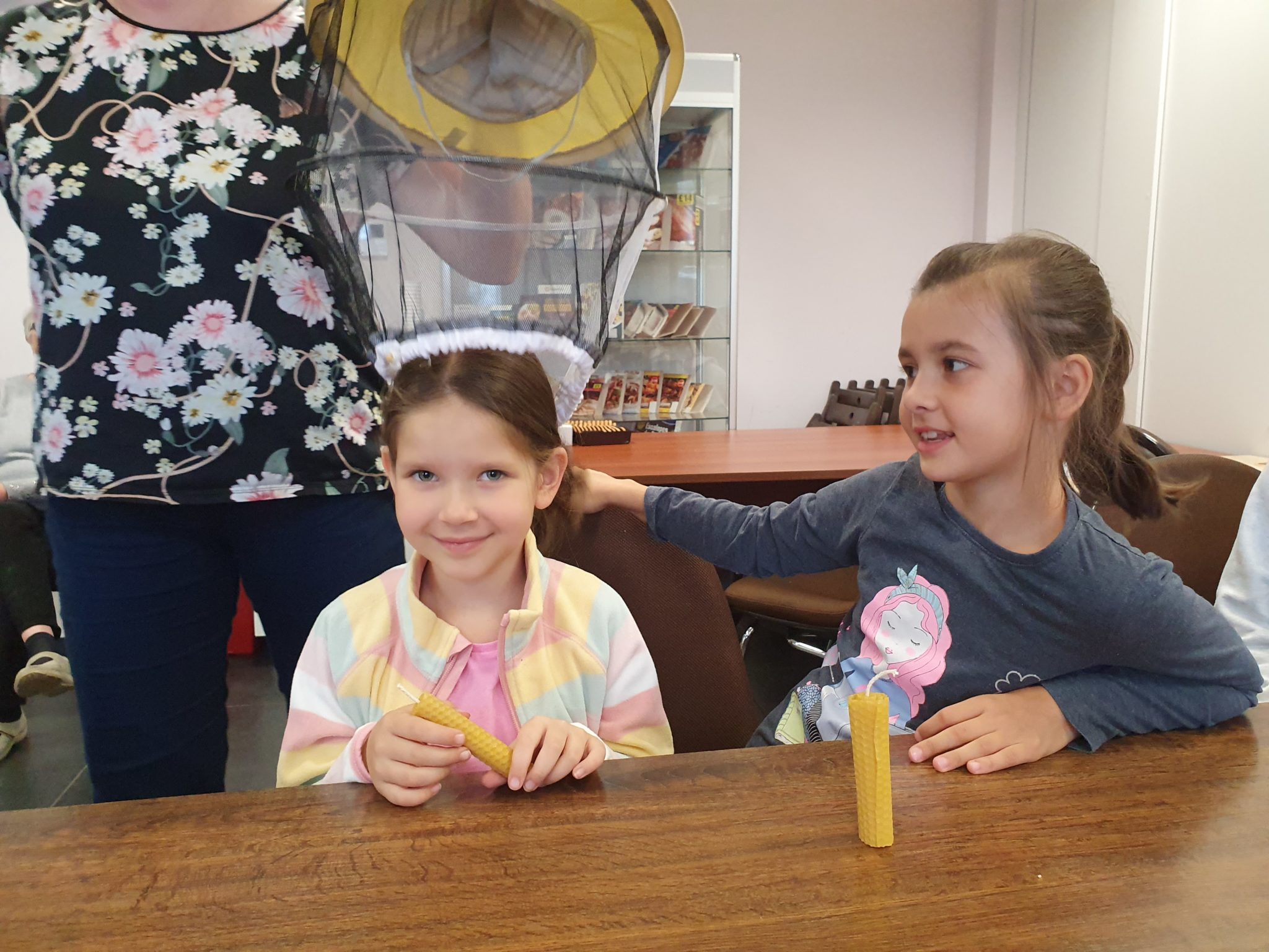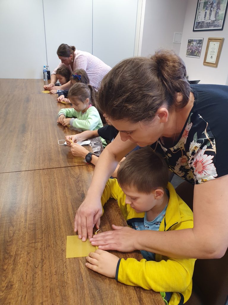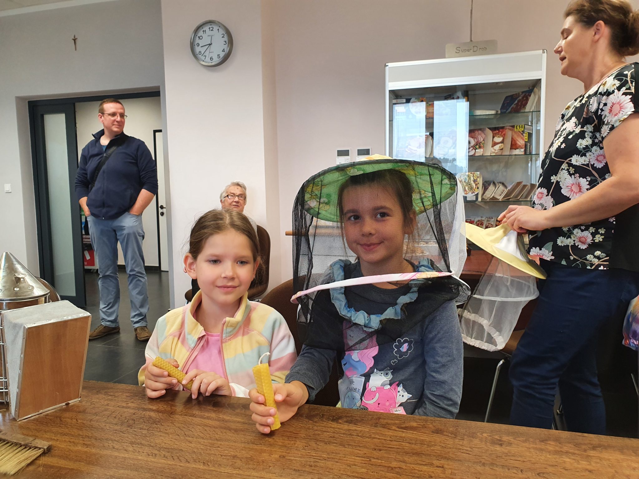 Ponadto, mali uczestnicy mieli okazję przymierzyć strój i inne gadżety potrzebne do pracy pszczelarza, spróbować pysznego miodu, a także wykonać świecę z węzy pszczelnej. Dzieci były bardzo zaangażowane, brały czynny udział i zadawały mnóstwo pytań o królową matkę po trutnia.
