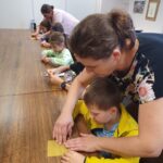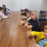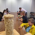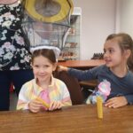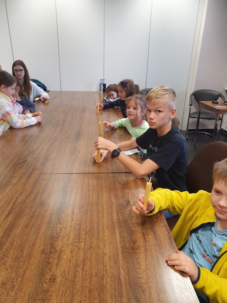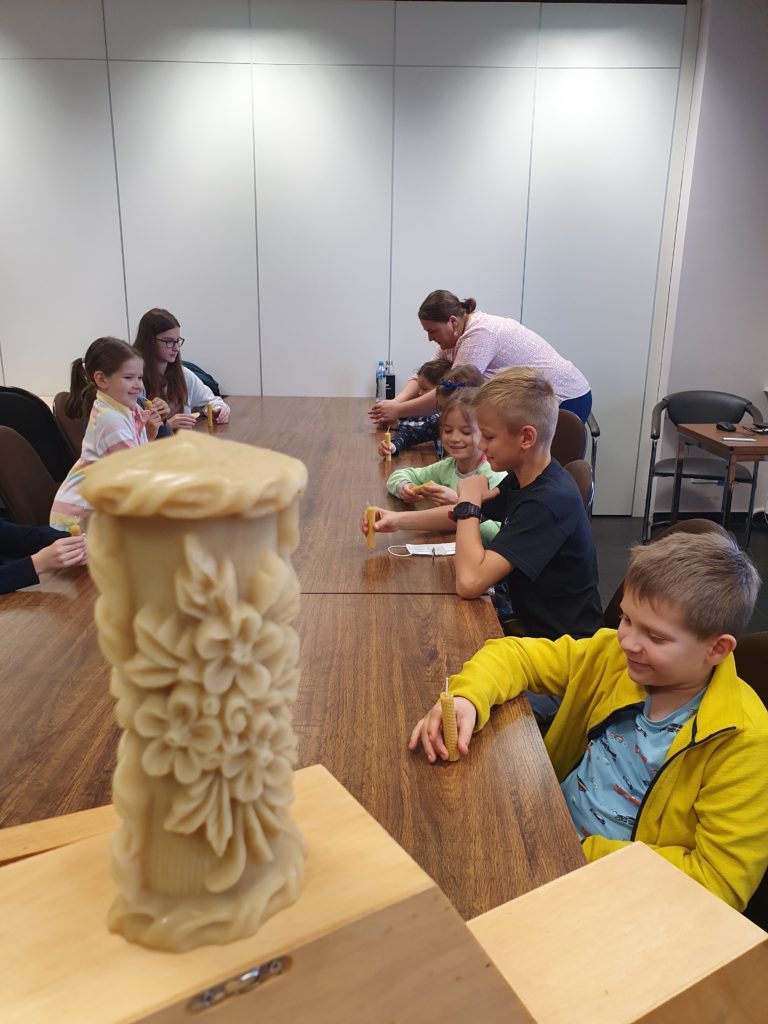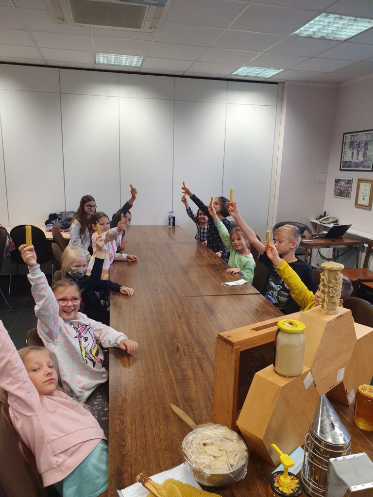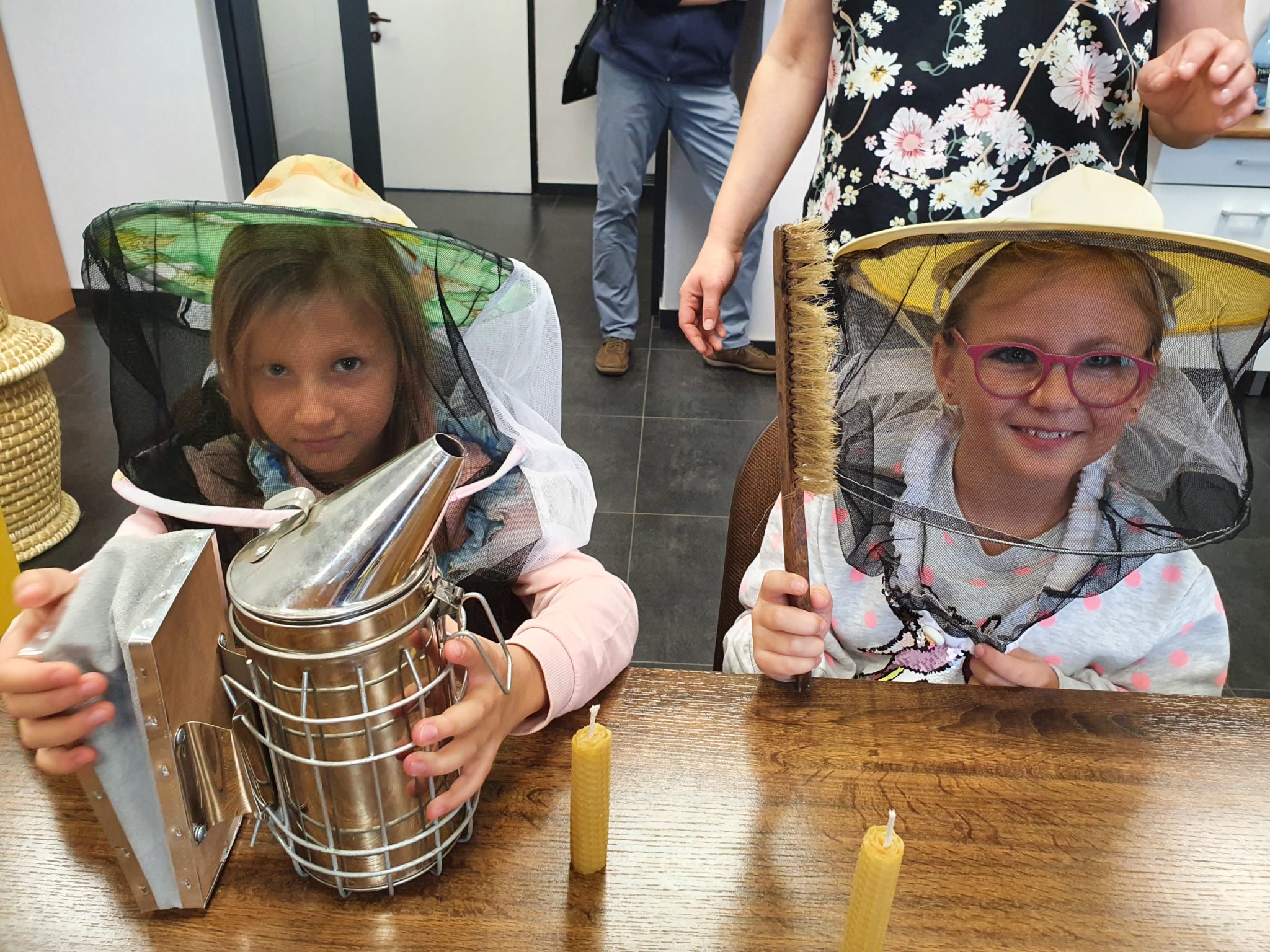 Ponadto, mali uczestnicy mieli okazję przymierzyć strój i inne gadżety potrzebne do pracy pszczelarza, spróbować pysznego miodu, a także wykonać świecę z węzy pszczelnej. Dzieci były bardzo zaangażowane, brały czynny udział i zadawały mnóstwo pytań o królową matkę po trutnia.